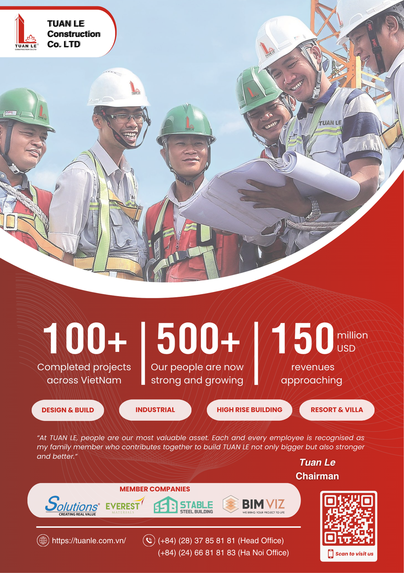 Thành lập năm 2009, TUẤN LÊ CONSTRUCTION đã xây dựng uy tín vững chắc thông qua hơn 100 dự án thành công khắp Việt Nam nhờ vào giá trị gia đình, sự tin cậy và tính liêm chính. Với đội ngũ 500 nhân viên và doanh thu gần 150 triệu USD, TUẤN LÊ là đơn vị luôn mang đến chất lượng và độ an toàn cao nhất cho khách hàng. Công ty đặt mục tiêu trở thành nhà thầu hàng đầu, luôn giữ đúng cam kết, năng động, và làm việc đồng đội. Các dự án của công ty xây dựng TUẤN LÊ trải dài toàn quốc, với khả năng thực hiện dự án từ 1 triệu USD đến hơn 100 triệu USD.